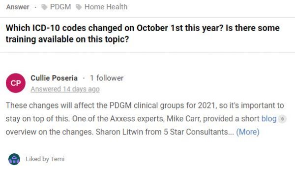 All users are encouraged to ask as many questions as they want. Whether it’s about an Axxess feature, like how to upload an ID to our home health staffing app, or new industry regulations, like clarification on the ICD-10-CM code changes, we want everyone to know it all.