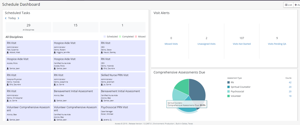 When a patient elects to receive hospice care, CMS guidelines require that the IDG team completes a comprehensive assessment within five days. This is another area where a citation is issued for compliance failure. Timing is important in hospice care, which is why Axxess Hospice has built-in features to enable agencies to stay compliant. The software dashboard has a section with alerts when a patient changes status within the last 24 hours. This will help hospice professionals see when a new patient is ready for an assessment. Schedulers can go directly to the Schedule Center in Axxess Hospice to schedule an IDG team member for the assessment.