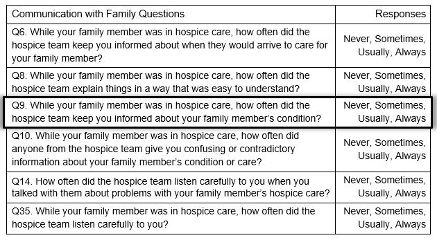 Question 9 is one of six questions comprising the Communication with Family domain, designed to assess the hospice team’s communication proficiency.