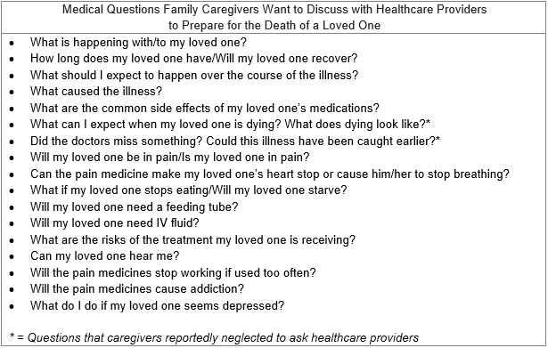A study published in the Journal of Palliative Medicine analyzed questions that family caregivers believe are important to discuss with healthcare providers in preparation for the death of a loved one. Caregivers’ questions were categorized under medical, practical, psychosocial and spiritual dimensions. Medical questions are listed in descending order below.