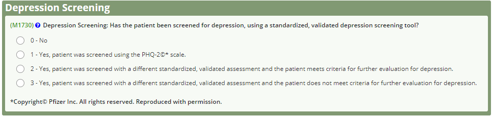 Items in the Neuro/Behavioral Status tab have remained the same but guidance in the tool tips has been updated. As in other assessment tabs, collaboration is allowed for completion of the Depression Screening. Another clinician may use the screening tool and report to the clinician responsible for completing the OASIS assessment. This must be done within the five-day period allowed for completing the assessment.
