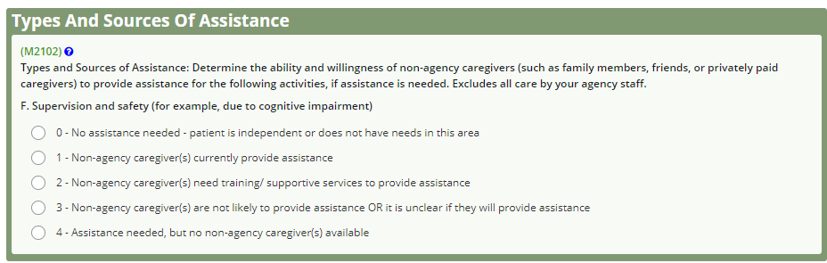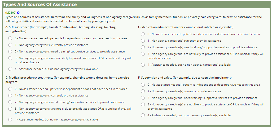 In M2102 Types and Sources of Assistance, sections A-E and G have been removed in the Start of Care OASIS. Sections B, E and G have been removed in the Discharge OASIS.