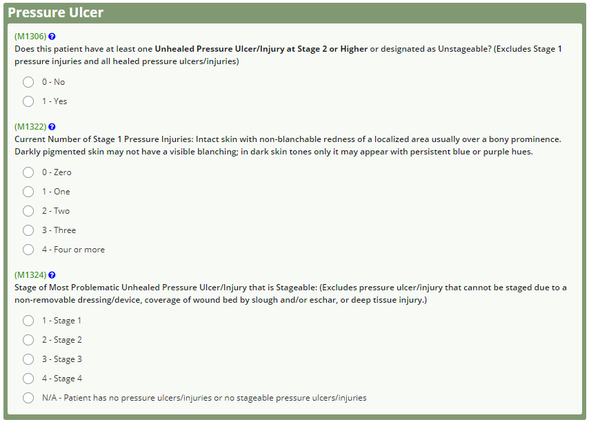 To standardize the language and assessment across post-acute settings, items related to pressure ulcers (M1306, M1311, M1322, M1324) have been updated to correspond with the National Pressure Ulcer Advisory Panel (NPUAP) terminology (e.g., “Pressure Ulcer” has been updated to “Pressure Ulcer/Injury”).