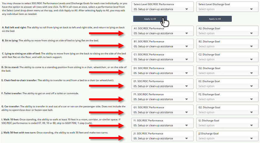 The Apply to All feature on this tab allows all items in a section to be completed with a single click, maximizing efficiency and ease of use, and reducing documentation time. Clinicians can choose to answer each row individually, or use the Apply to All feature. After selecting Apply to All, items can be edited individually as needed.