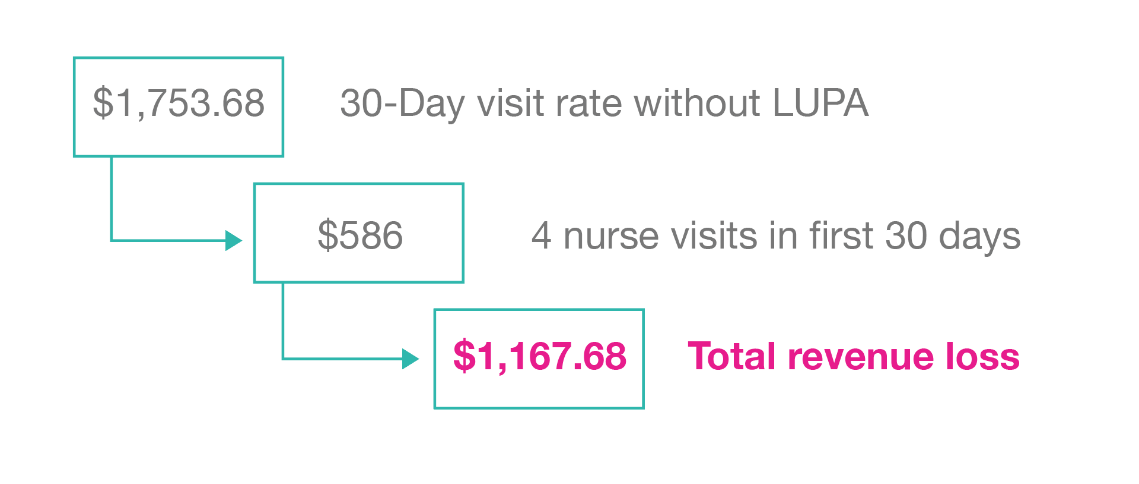 Below is an example of LUPA reimbursement and revenue loss for a 30-day billing period. Let’s assume the diagnosis would require five visits to avoid becoming a LUPA. A provider that is only able to complete four visits would receive a reimbursement of $586 under the 2019 CMS LUPA rates, which represents a total revenue loss of $1,167.68
