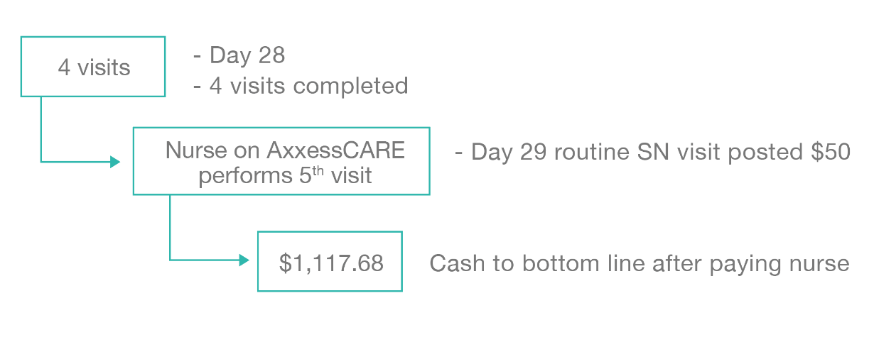 Using AxxessCARE, an agency sets the rates for each visit, and under the right circumstances this solution can help the agency avoid a LUPA. Using the same scenario used above, the diagram below shows how posting a visit on AxxessCARE at a rate of $50 can avoid a LUPA for the billing period, which brings in hundreds of more dollars to the bottom line.
