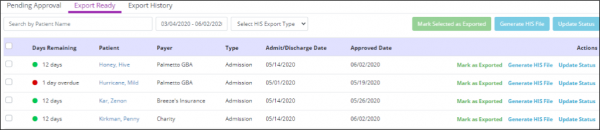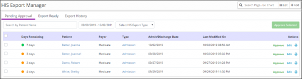 On each tab, you can search by patient name, filter by date range, and/or filter by HIS export type to locate a specific record. On the left side of the screen, the Days Remaining column displays the number of days before the HIS must be approved or submitted.