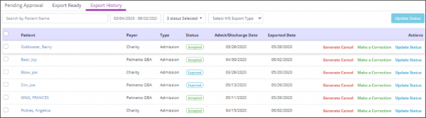 In the top right corner, the blue Generate HIS File button enables you to generate an export file by checking the boxes next to the desired files and clicking the blue button. Once a file is exported, you can label files as exported using the green Mark Selected as Exported button. If you realize an HIS document was approved that needs correction, the Update Status link will move the HIS document back to the Pending Approval tab for editing. When the document is marked as exported, the document moves to the Export History tab.