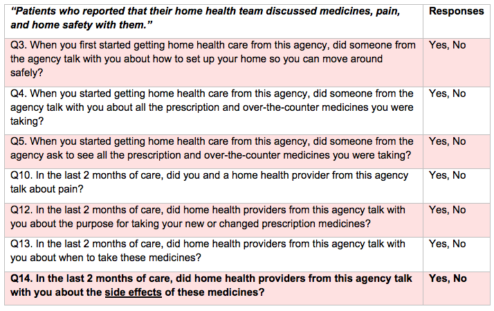This question evaluates the patient’s perception of whether home health providers discussed medication side effects when introducing or changing a medication during the patient’s care. This evaluation builds on the initial medication assessment in questions 4 and 5, gauging patients’ knowledge of their medication and its contributions to achieving treatment goals. Optimizing performance on this question relies on an organization’s ability to ensure any changes made to a patient’s medication regimen are routinely accompanied by thorough discussion of the associated side effects.