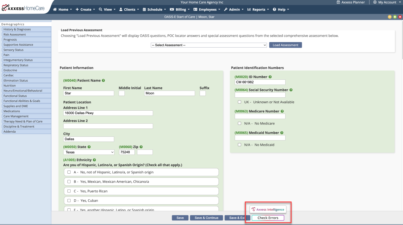 The Axxess Home Care OASIS scrubber, driven by Axxess intelligence®, performs comprehensive auditing of OASIS documentation, checking for: