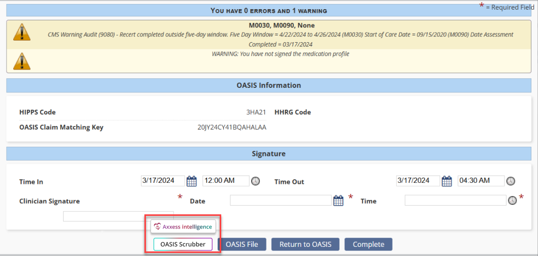 If no errors are detected, the signature screen will display. Click OASIS Scrubber to download a PDF copy of the OASIS audit findings.