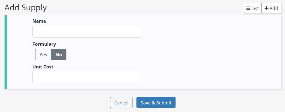 In the Add Supply screen, enter the name of the supply. The Formulary and Unit Cost fields are not required, but will help your agency track costs.