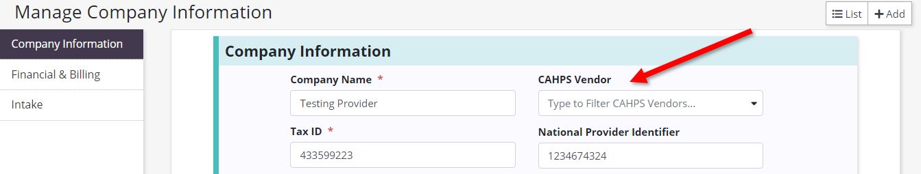 Select Manage Company Information under the Admin tab. The CAHPS Vendor field is located in the top right of the Company Information section.