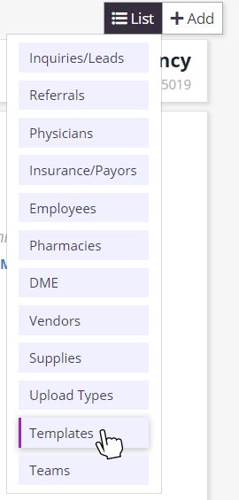 Select the List icon that appears in the top right corner of all pages in Axxess Hospice. Select Templates from the drop-down menu.