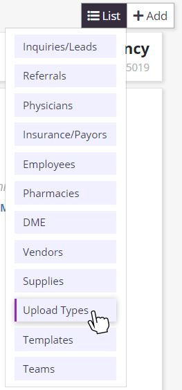 Select the List icon that appears in the top right corner of all pages in Axxess Hospice. Select Upload Types from the drop-down menu.