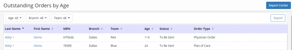 Report Includes: Patient Name, MRN, Branch, Team, Order Age, Order Status, Order Type