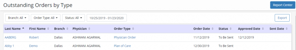 Report Includes: Branch, Physician, Patient Name, Order Type, Order Date, Sent Date
