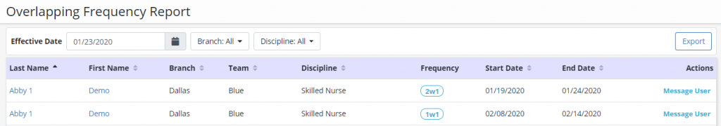Report Includes: Patient Name, Branch, Team, Discipline, Frequency, Start Date, End Date