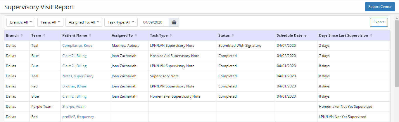 Report Includes: Branch, Team, Patient Name, Employee Name, Task Type, Status, Schedule Date, Days Since Last Supervision