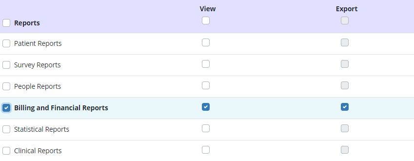 Users must have permission to view Billing and Financial Reports to generate this report. To give a user this permission, navigate to the People Center and edit the user’s profile. On the Permissions tab, scroll to the Reports section and select the View/Export boxes next to Billing and Financial Reports. Click Save.
