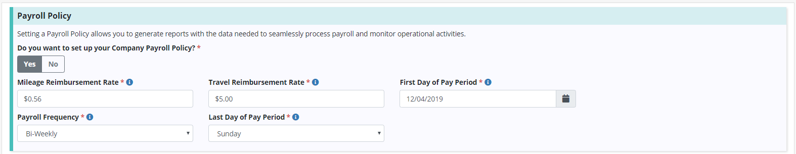 The reimbursements selected under Allowable Reimbursements will apply the rates set in your company payroll policy and appear in your payroll for this user.