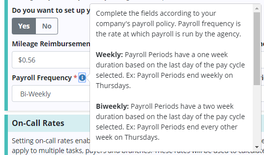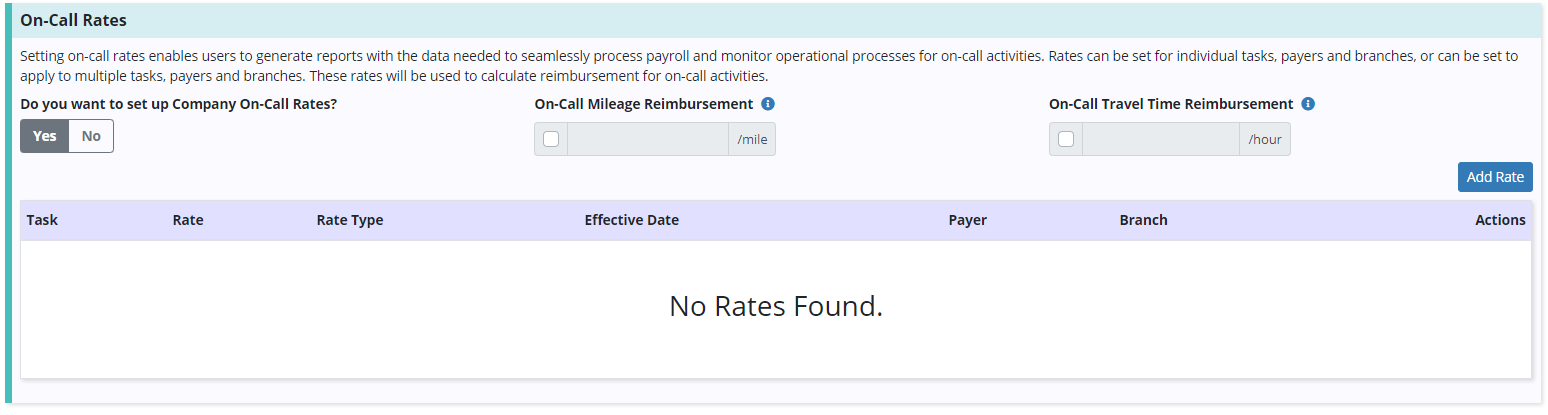 To set up On-Call Rates, select Yes in the On-Call Rates section under Do you want to set up Company On-Call Rates?