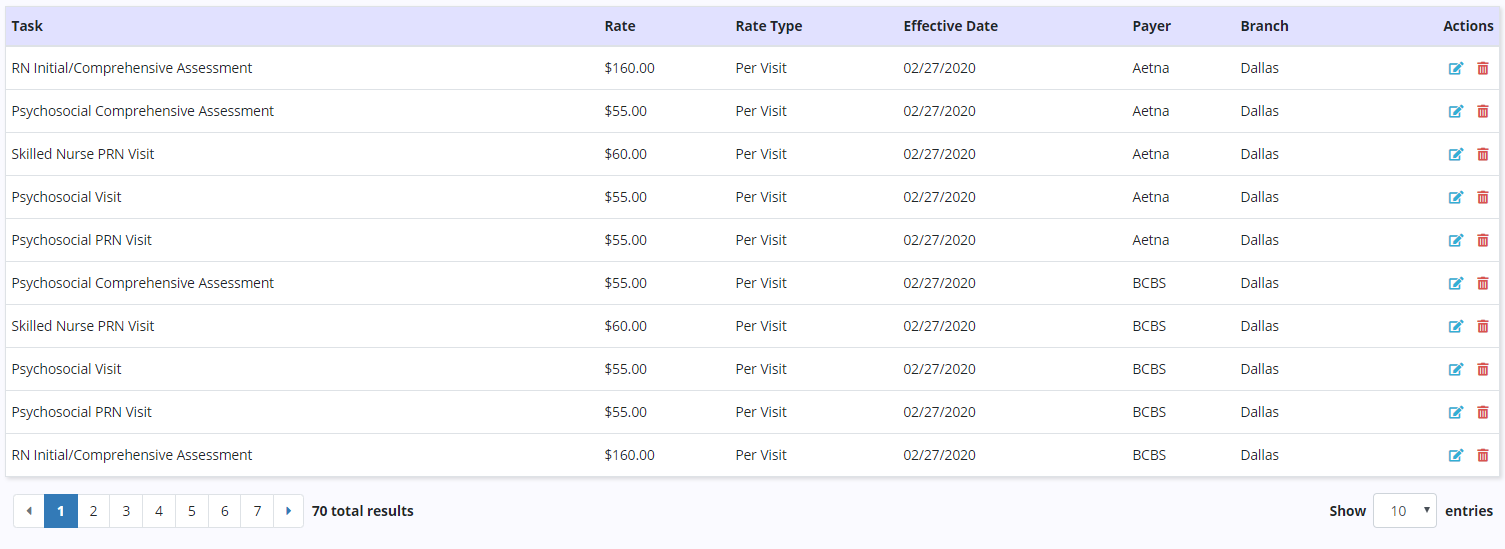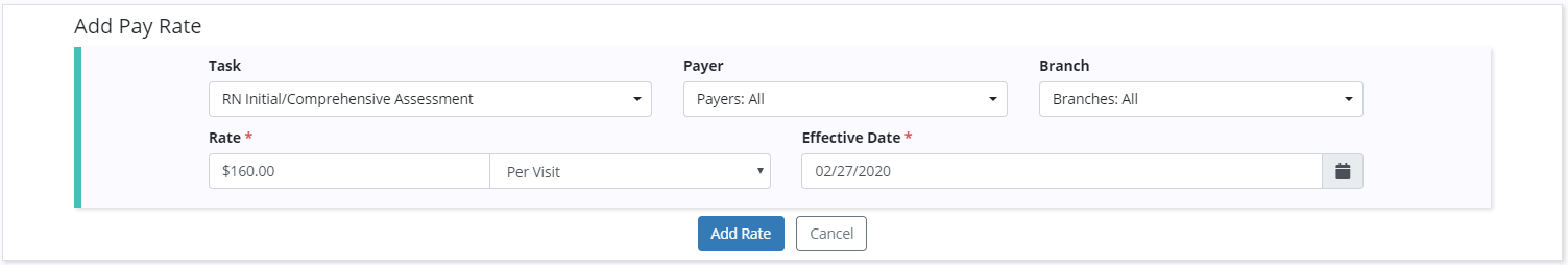 To add a new rate, click Add Rate and select the task, payer, branch, rate and effective date. To create the same rate for multiple tasks, payers, or branches, select the desired options from the respective drop-down menus and click Add Rate. A row will be added to the rate table for each task, branch, and payer specified.