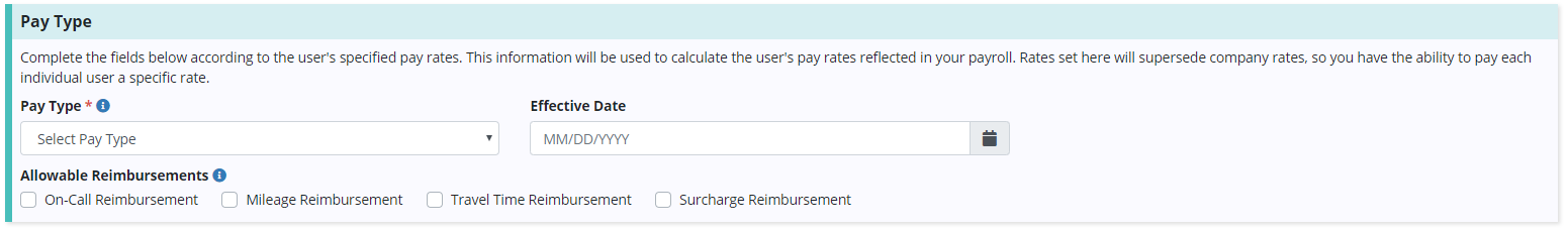 Navigate to the Payroll tab on the left side of the user’s profile. Enter the user’s pay type, effective date, and allowable reimbursements in the respective fields.
