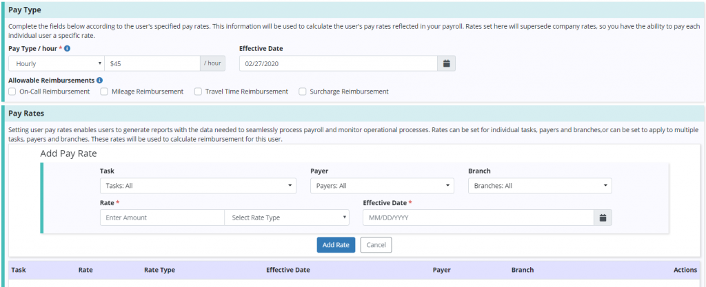 For per hour and per visit employees, a separate Pay Rates section will enable you to specify different rates for individual tasks completed by the user.
