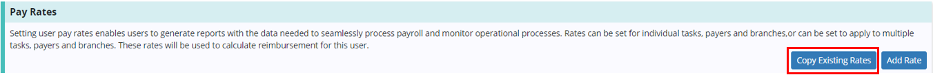 To copy rates from an existing user and streamline the payroll setup process, click Copy Existing Rates and select the user whose rates you want to copy.