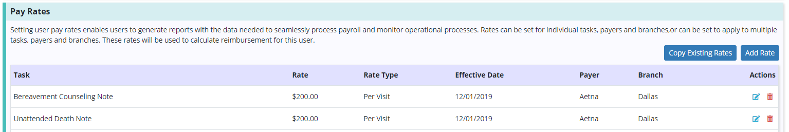 Rates set for the user will populate in the rates table. To adjust a rate, click the blue edit icon under Actions and make the appropriate changes.