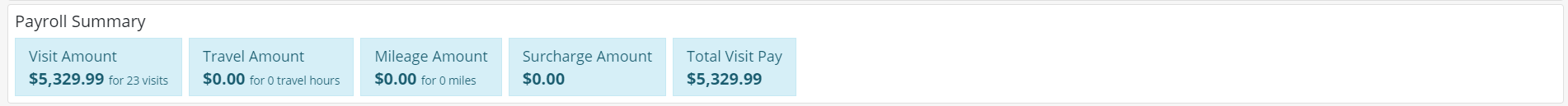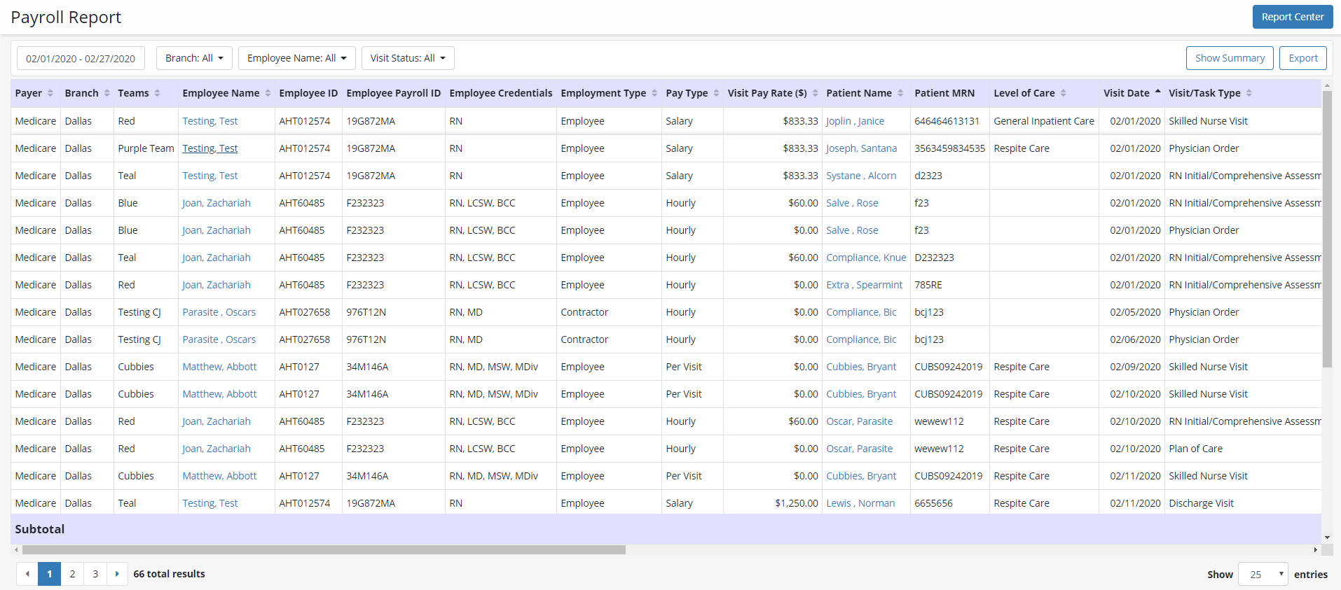 On the Payroll Report screen, click Show Summary in the top right corner to view a summary with total values for the entire report. The total value of each individual page appears at the bottom of the page labeled Subtotal.