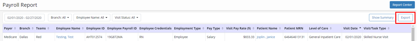 To generate the Payroll Report, navigate to the Report Center under the Reports tab. Select Payroll Report from the Billing and Financial Reports section.