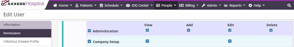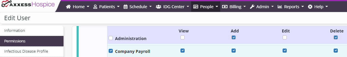 To give a user permission to view, add and edit company payroll, select View, Add and Edit next to the Company Payroll permission.