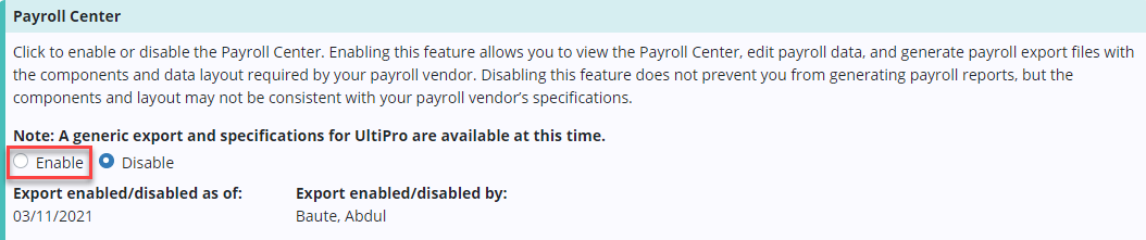In the Payroll Center section, select Enable. Enabling the Payroll Center allows users to view the Payroll Center (under the People tab), edit payroll data and generate payroll export files with the components and data layout required by the organization’s payroll vendor.