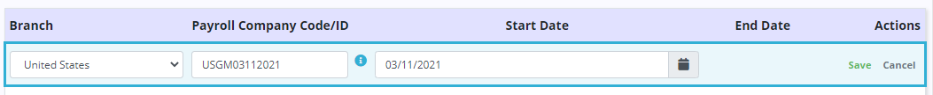 Select Add Branch to associate payroll company codes/IDs to the payroll branches within your organization. Select the branch, enter the payroll company code/ID (provided to you by your payroll vendor), and enter the start date. Click Save.