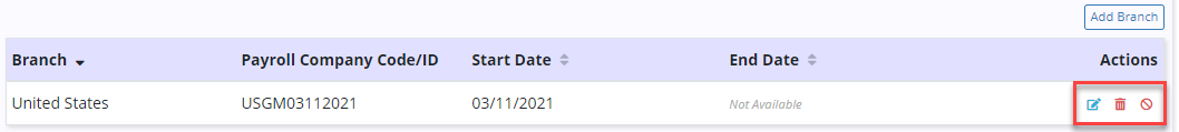 Users can edit, delete or deactivate the associated payroll company codes/IDs by selecting the edit, delete or deactivate icons under Actions.