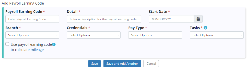 To add a payroll earning code, click Add Earning Code. Complete the required fields and click Save.