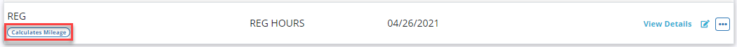 Payroll earning codes marked to calculate mileage will display on the table with a blue Calculates Mileage tag.