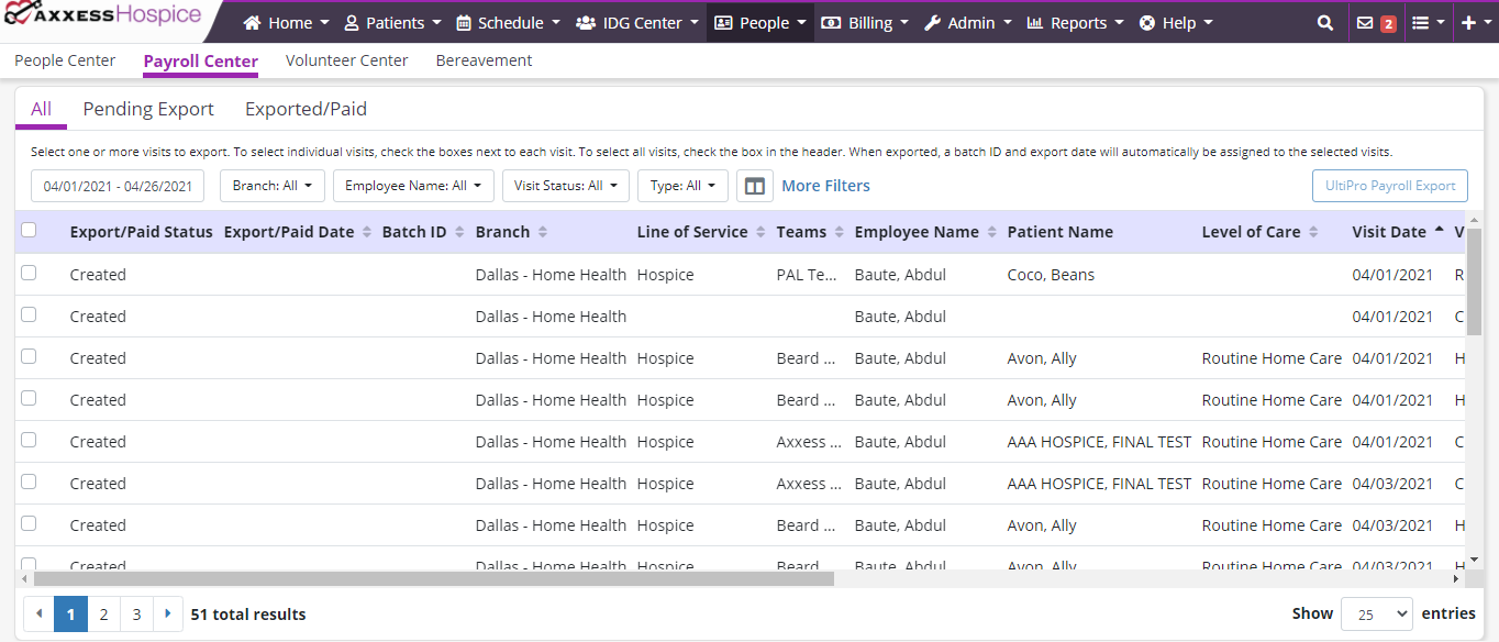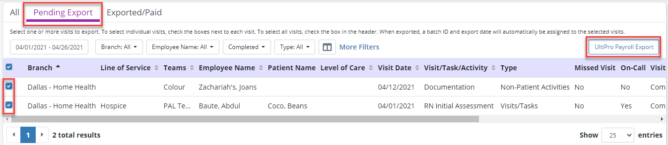 Visits and NPA tasks can be selected for export from the All and Pending Export tabs in the Payroll Center. To export visits and/or NPA tasks, check the boxes next to the desired visits/tasks and click UltiPro Payroll Export.