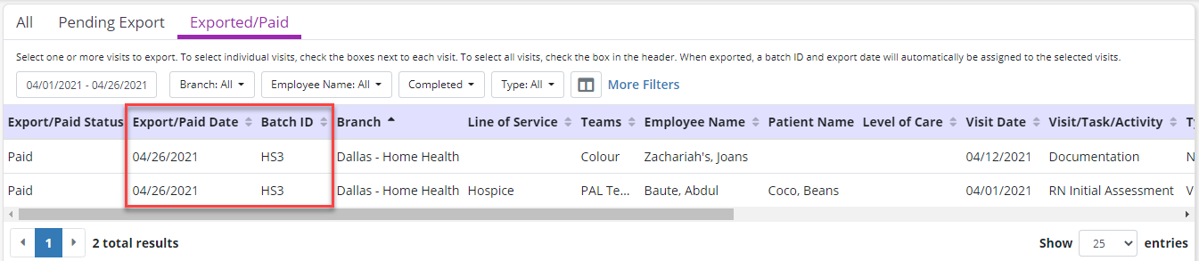 The exported visits/tasks will no longer appear on the Pending Export tab, but will appear on the All and Exported/Paid tabs.