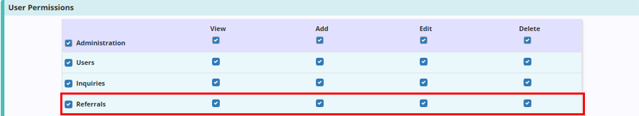 To give a user permission to enter and validate addresses in referrals, edit the user’s profile and navigate to the Permissions tab. In the Administration section, select the boxes next to the Referrals permission to enable the user to view, add, edit and/or delete referral data.