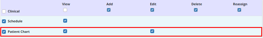 To give a user permission to enter and validate addresses in patient charts, edit the user’s profile and navigate to the Permissions tab. In the Clinical section, select the boxes next to the Patient Chart permission to enable the user to view and edit data in patient charts.