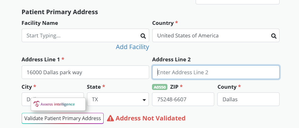 GPS navigation service is integrated in Axxess Hospice to streamline address documentation. When entering an address under Patient Primary Address, addresses that match your search will appear as you type.