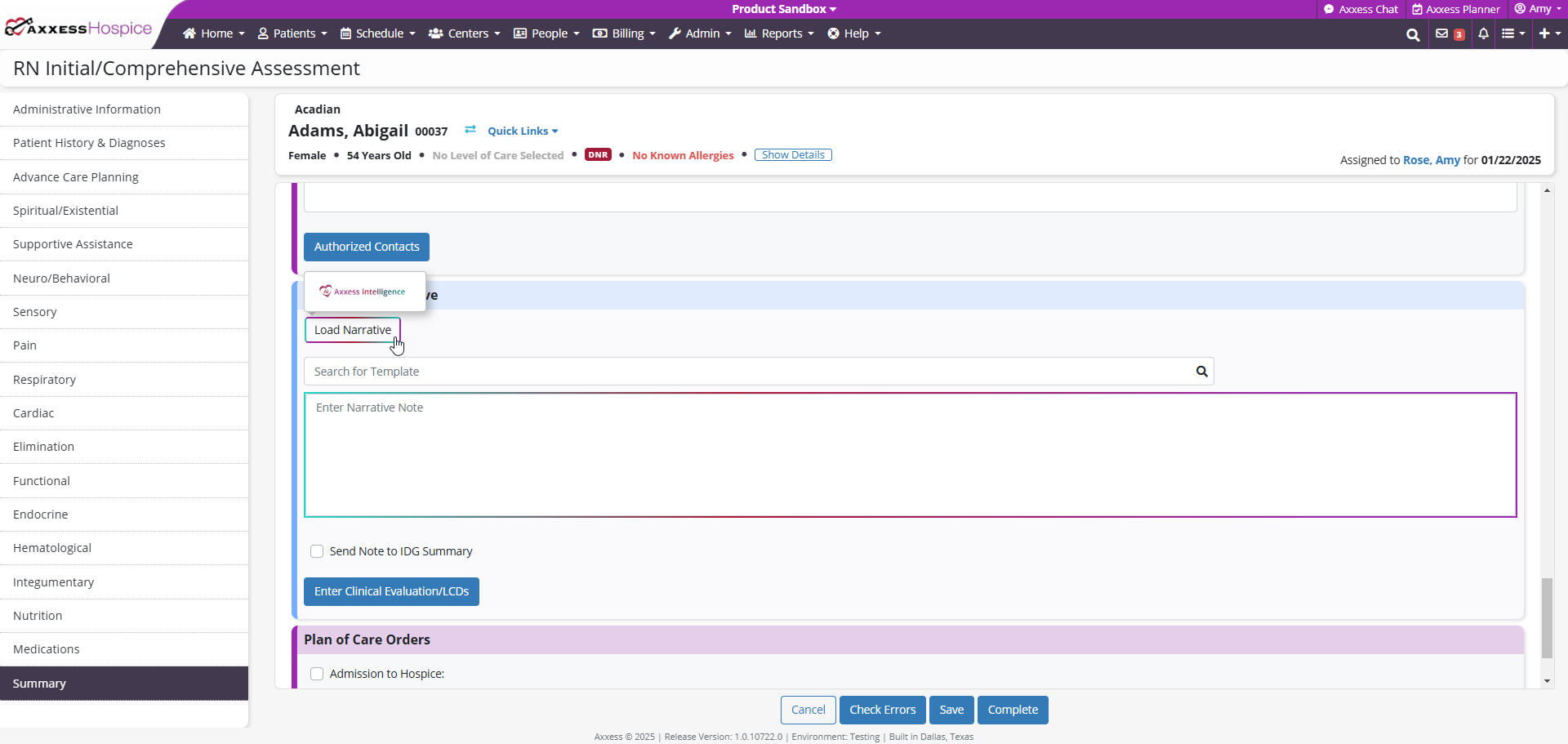 Axxess Hospice uses Axxess intelligence® to automatically generate narrative notes in the RN Initial/Comprehensive Assessment, RN Initial Assessment, RN Recertification Assessment, and RN Comprehensive Assessment.