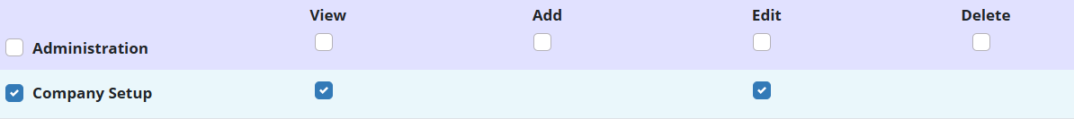 To give a user permission to view and edit Company Setup, edit the user’s profile and navigate to the Permissions tab. In the Administration section, select View and Edit next to the Company Setup permission. Click Save to finish granting the permissions to the user.