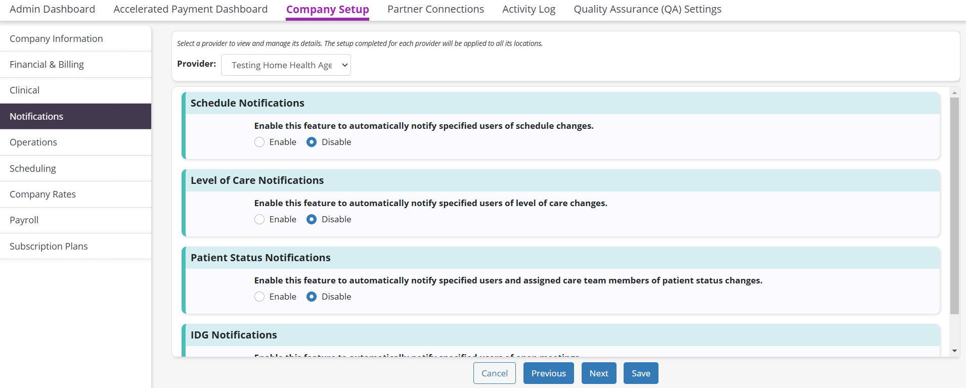Admin tab ➜ Company Setup ➜ Notifications tab