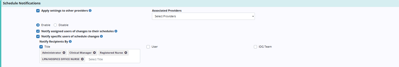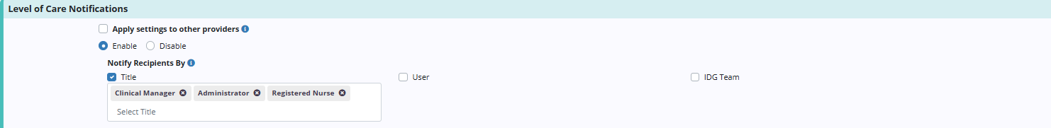 When Enable is selected under Level of Care Notifications, a Notify Recipients By field will appear with the following checkboxes: Title, User and IDG Team. Use these fields to indicate which users should receive level of care notifications.