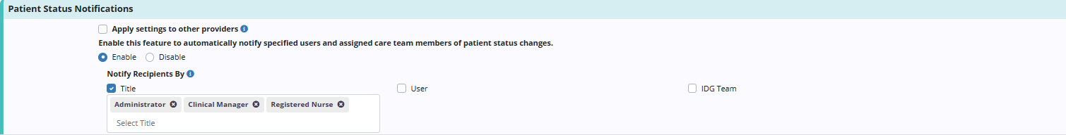 When Enable is selected under Patient Status Notifications, a Notify Recipients By field will appear with the following checkboxes: Title, User and IDG Team. Use these fields to indicate which users should receive patient status notifications.