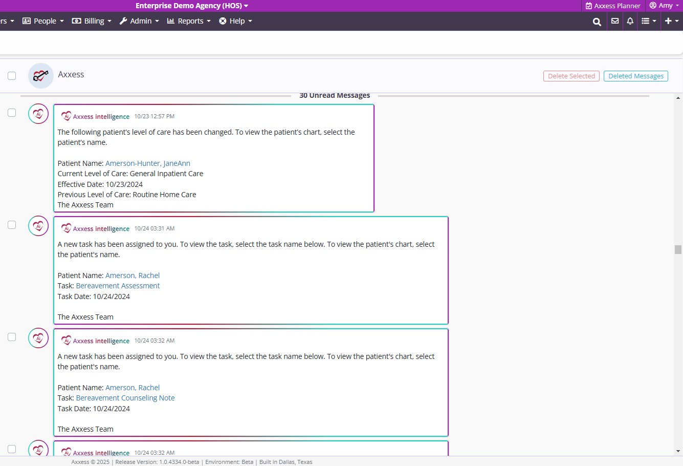 Axxess Hospice uses Axxess intelligence® to offer a range of notifications that organizations can enable to alert individual users or entire teams to scheduling changes, level of care changes, patient status changes and/or open IDG meetings.